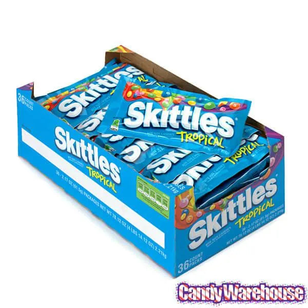 Display box contains 36 packets of Skittles Tropical Bite Size Candies.