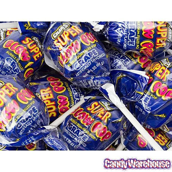 Set contains 72 Grape Charms Super Blow Pops Fun House Lollipops with a refillable container.