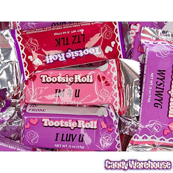 Delicious classic Tootsie Rolls all dressed up in romantic Valentine's Day colors! Each wrapper features a romantic text phrase, such as "KRA Z 4U", "U R DA 1", and "Q T PIE".