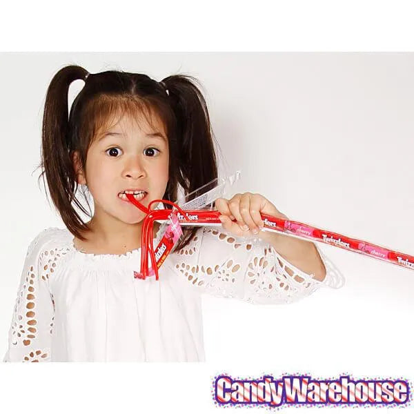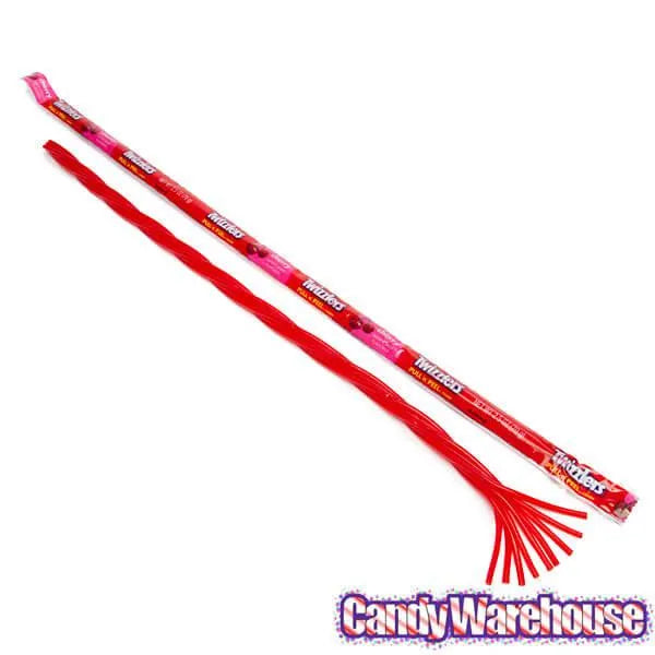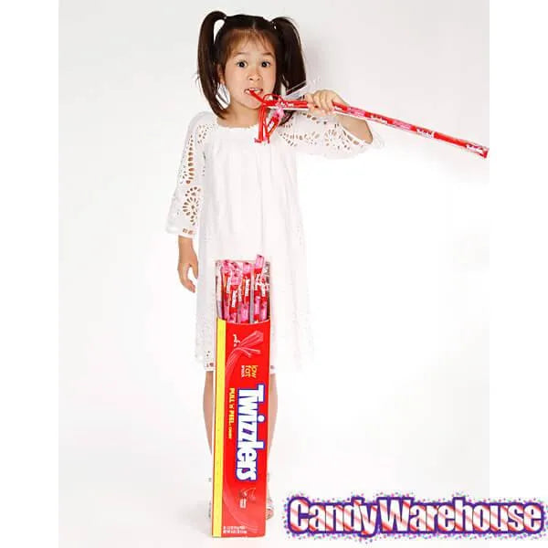 Display box contains 20 wrapped Twizzlers 2-Foot Cherry Pull-n-Peel Licorice Twists.