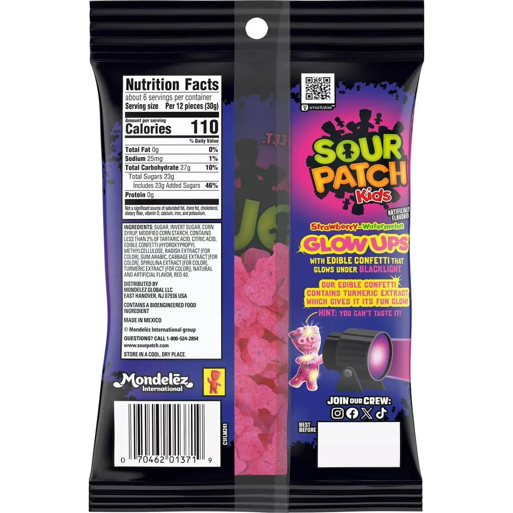 SOUR PATCH KIDS Glow Ups take your favorite sour-then-sweet candy to the next level—literally! These watermelon and strawberry-flavored gummies are packed with edible confetti and feature turmeric extract that makes them glow under blacklight. Perfect for parties, concerts, or any moment that needs a little extra shine.