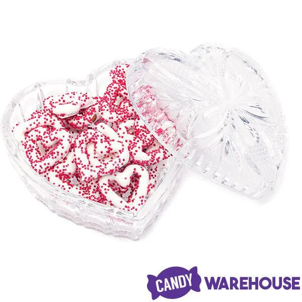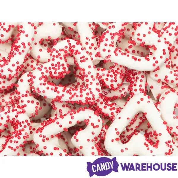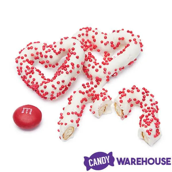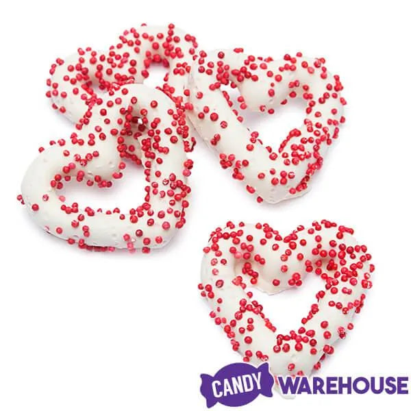 Bag contains 5 pounds of White Chocolate Frosted Valentine Mini Pretzel Candy Hearts.