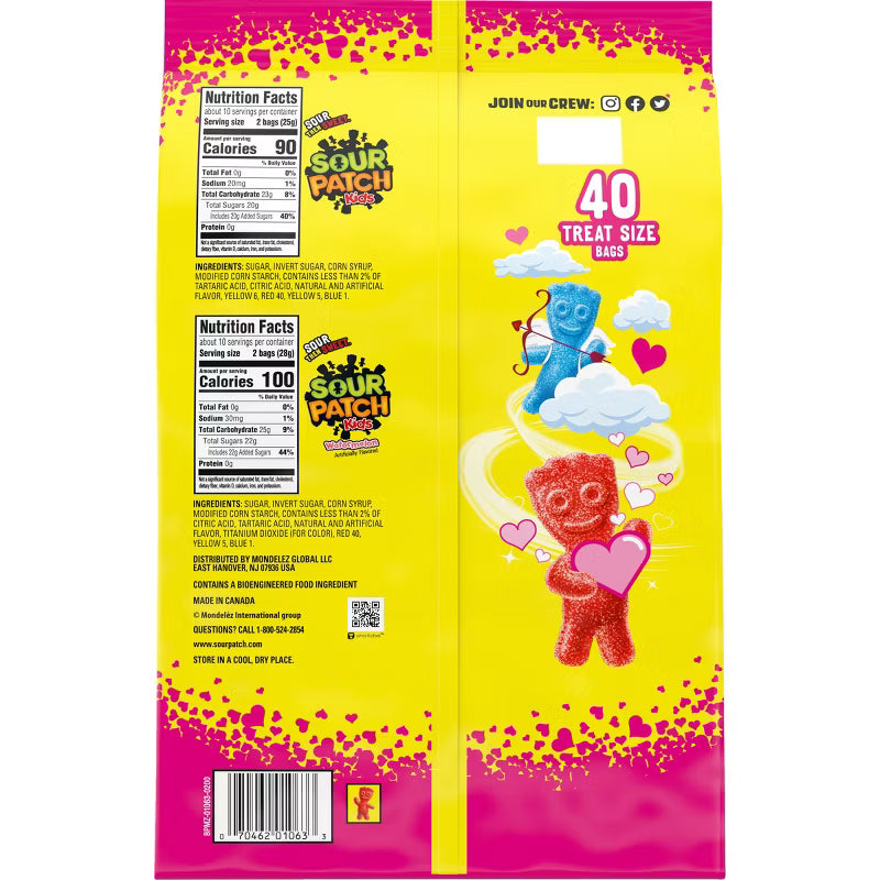 Bag contains 40 treat size packs of Valentines Sour Patch Kids Candy.