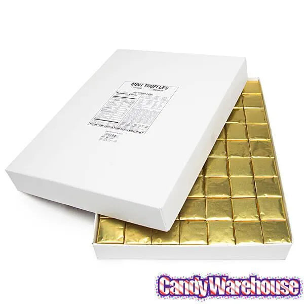 Box contains 5 pounds of Gold Foiled Truffle Mint Chocolate Squares.