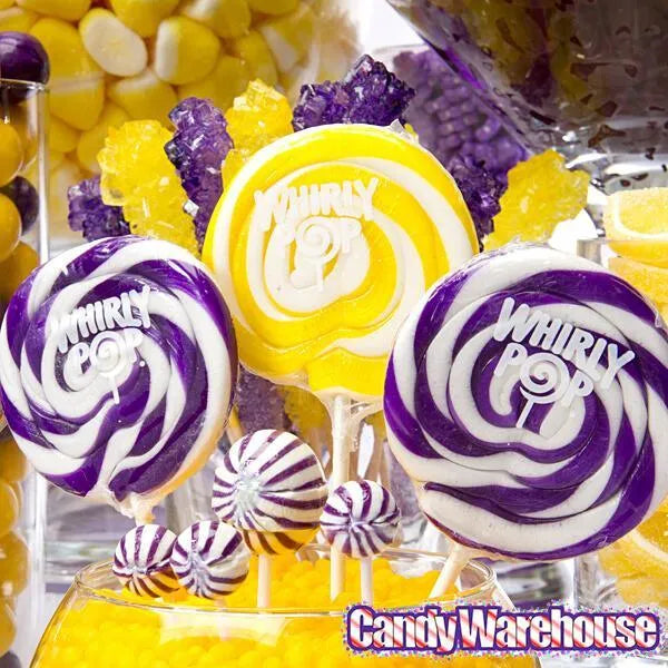 Display box contains 24 wrapped Yellow & White Swirl Whirly Pops, each with a net weight of 1.5 ounces.