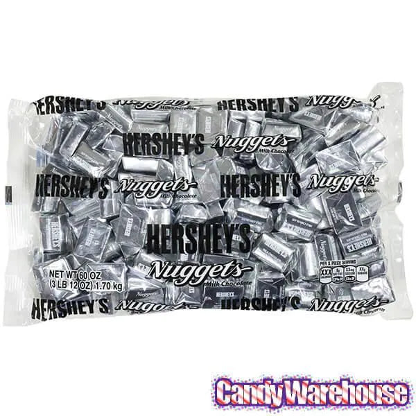 Bag contains 3.75 pounds of Hershey's Nuggets Silver Foiled Milk Chocolate Candy.