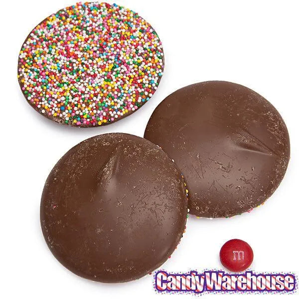 These fine milk chocolate disks, festooned with colored sprinkles, remind us of chocolate UFO's. Land some in your mouth today!