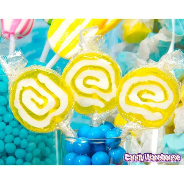 Bag contains 100 individually wrapped Petite Hypno Pops Yellow & White Swirled Lollipops.