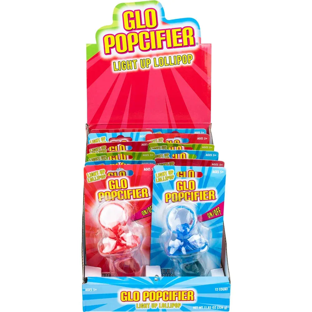 Display contains 12 Glo Popcifier Light-Up Lollipops, each with a net weight of 1 ounce.