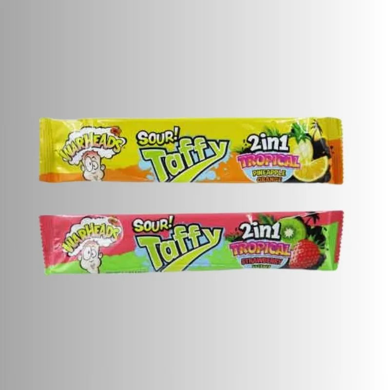 Warheads 2-in-1 Tropical Sour Taffy intensifies the iconic Warheads sour experience with a delightful twist. This sweet, chewy taffy features two bold, super sour flavors—Pineapple and Orange—that transport taste buds to a tangy tropical paradise. Wrapped in a vibrant, eye-catching design with dynamic Warheads branding, this taffy is sure to stand out at your point of sale.