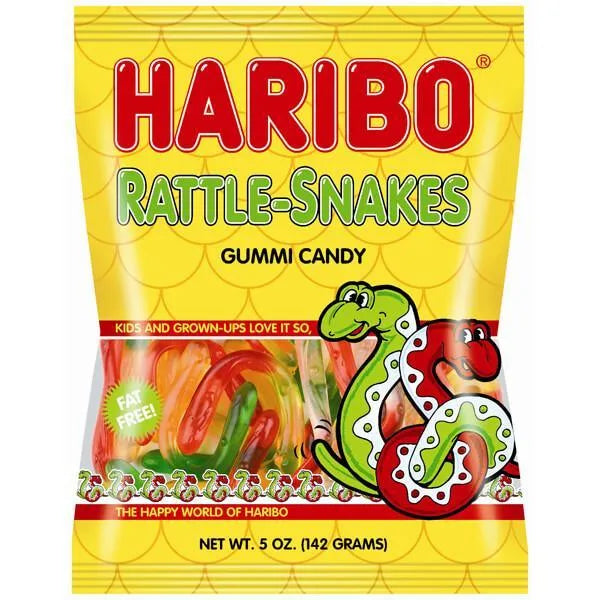 Box contains 3.75 pounds of Haribo Gummi Rattle Snakes Candy packed in 12 bags, each with a net weight of 5 ounces.