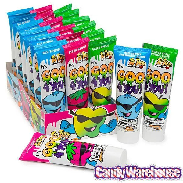 Display box contains 18 dispensers of Too Tarts Goo 4 You Sour Liquid Candy.