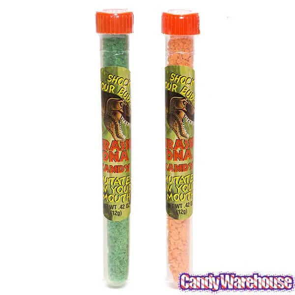 The plastic, resealable test tubes (straight from the dino lab!) are filled with watermelon and peach passion flavored carbonated candy nuggets. They’ll greet your tongue with a sizzling sensation and shock your mouth with giant Jurassic flavor!