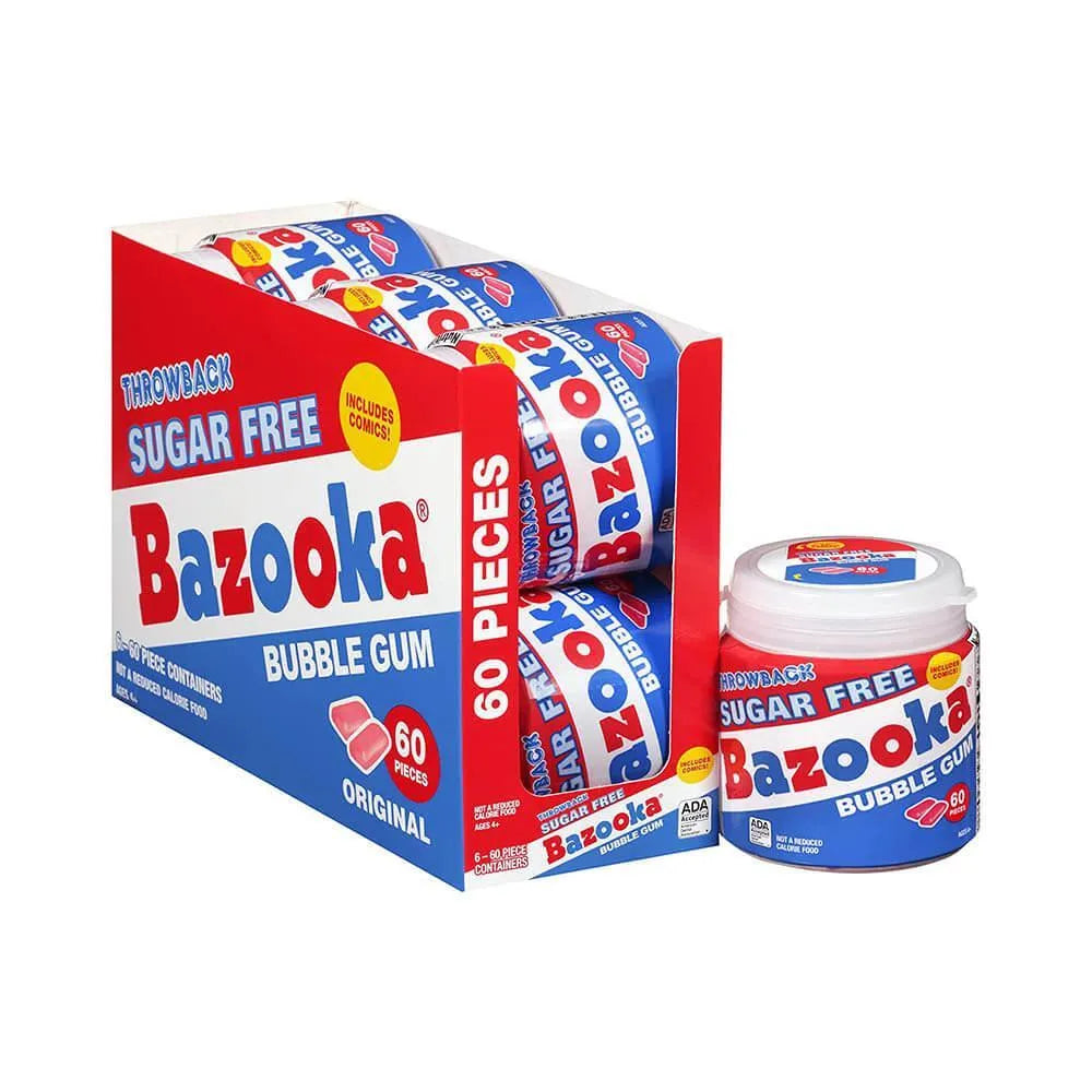 Travel lightly and sweetly with a Bazooka sugar-free bubble gum to-go cup. Now sporting the iconic brand’s original packaging, this sugar-free Bazooka gum cup is conveniently portable and made for sharing. With 60 individually wrapped pieces of chewing gum in each cup, it’s the perfect snack to pack along for sporting events, school outings, picnics, and parties. Kids and adults love the fun retro pink color and the Bazooka Joe comic inside every wrapper. Because this Bazooka gum is sugar-free, you get all the yummy flavor and chewy satisfaction of your favorite bubble gum with only 5 calories per piece. Stock up and save with this 6-piece box of throwback containers commemorating the classic look of one of the world’s favorite old fashion candy and gum brands. Candy Warehouse is bursting at the seams with retro sweets, so be sure to shop our entire collection for a nostalgic return to the past.
