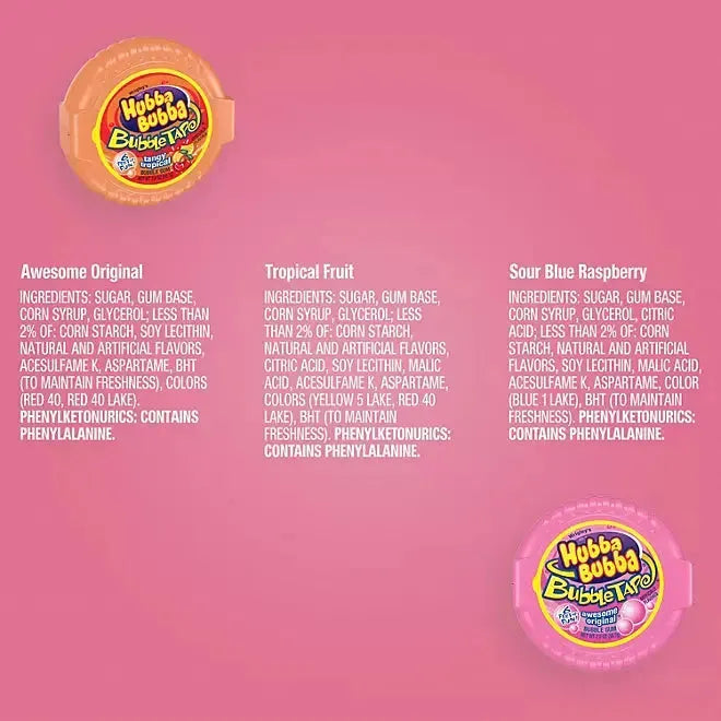 Display box contains 12 Hubba Bubba Bubble Tape Gum Rolls, each with a net weight of 2 ounces.