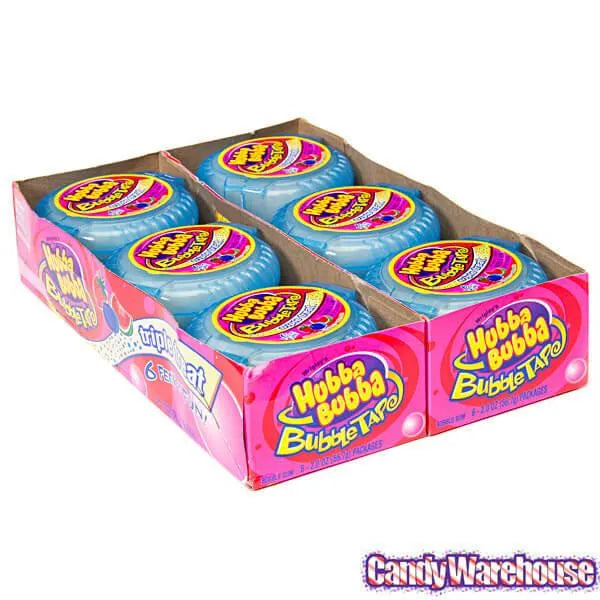Six feet of delicious bubblegum adhesive strips in a triple threat combination of blueberry, watermelon, and strawberry flavors!Display box contains 12 Bubble Tape Triple Threat Gum Rolls.Shipping Weight ~ 2 lbs.