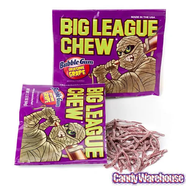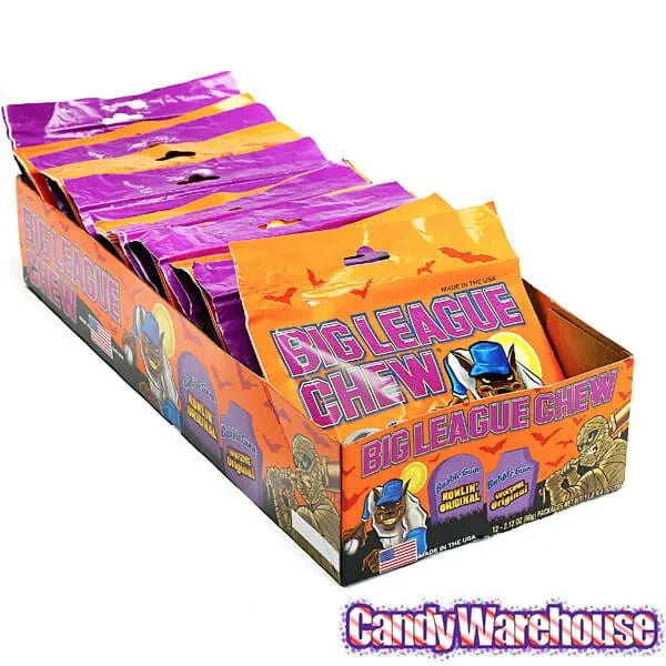 Box contains 12 Big League Chew Halloween Bubble Gum Pouches, 6 each of Original and Grape.