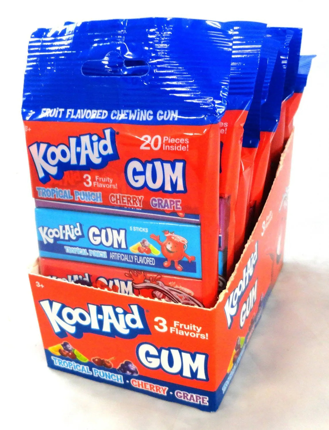 Ohhh yeahhh! Take a trip down memory lane with Kool-Aid Gum, where your favorite fruity drink turns into chewy, delicious candy fun. Each peg bag contains 4 packs of gum bursting with the classic tropical punch, cherry, and grape flavors you know and love.