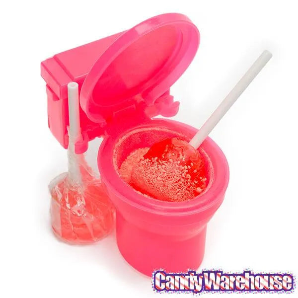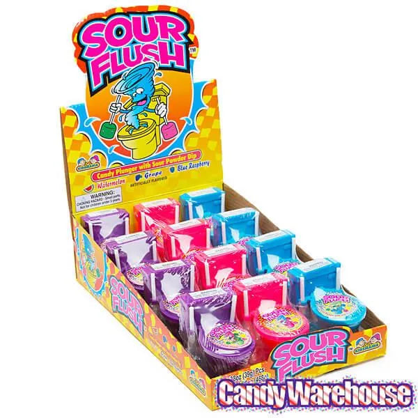 Display box contains 12 Sour Flush Candy Plunger Pops with Sour Powder Dip Toilets.