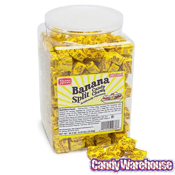 Tub contains 240 pieces of Yellow Banana Split Candy Chews Candy.