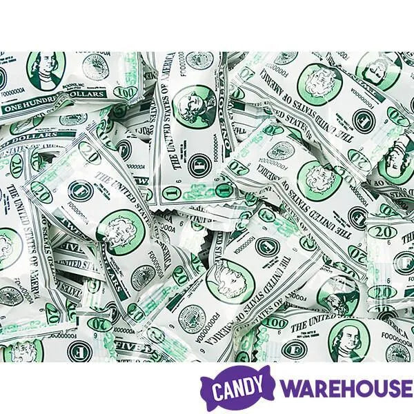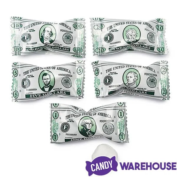 Light and airy buttermints.... sealed inside money wrappers. Featuring five different designs of real United States currency, these delicious denominations are sure to surprise and delight with every bite. Assortment includes $1 dollar bills, $2 dollar bills, $5 dollar bills, $20 dollar bills, and $100 dollar bills. Greenbacks never tasted so good! Perfect for the candy dish at your bank branch or the finance related project at your business.