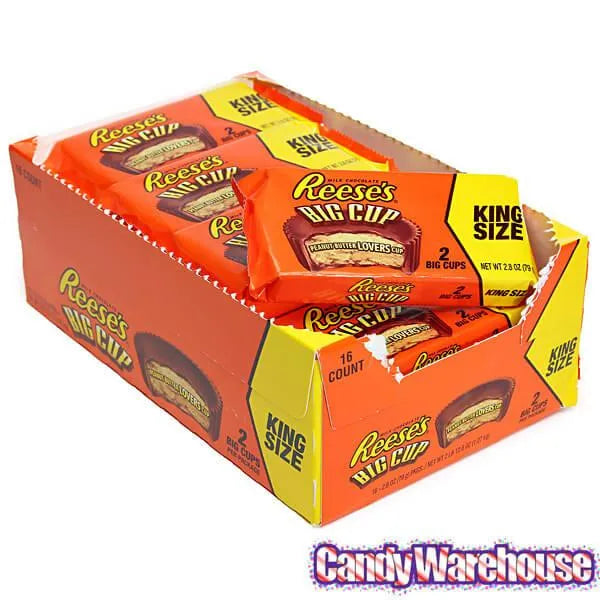 Display box contains 16 Reese's Peanut Butter Big Cups King Size Packs, each with a net weight of 2.8 ounces.