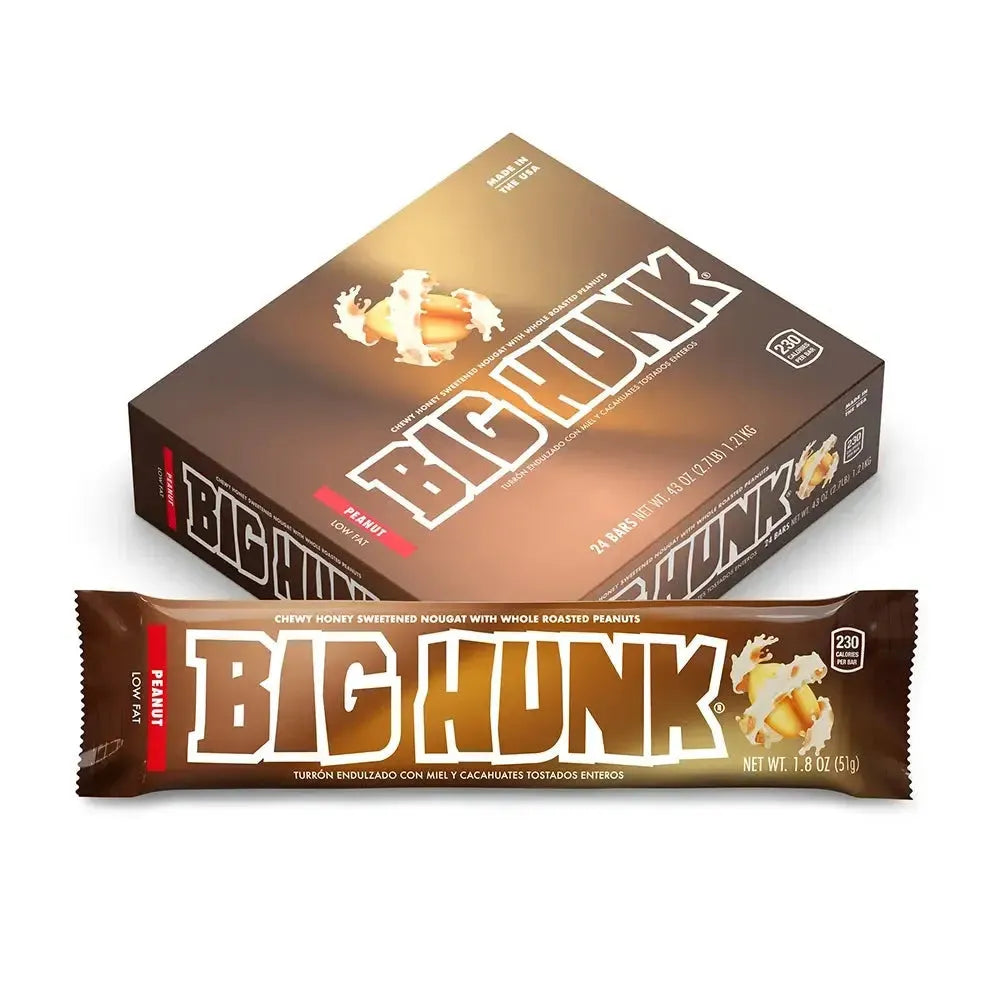 An old-fashioned candy bar favorite! Acquired back in 1970 from Hollywood Brands, Big Hunk has maintained it's loyal following since the early 1950's. True to its name, Big Hunk is made of a generous portion of chewy, honey-sweetened nougat filled with whole roasted peanuts. Big Hunk is one of the few candy bar items on the market today with very low fat content and qualifies as a "LOW FAT" item, just 3 grams of fat for a generous 1.8-ounce bar.