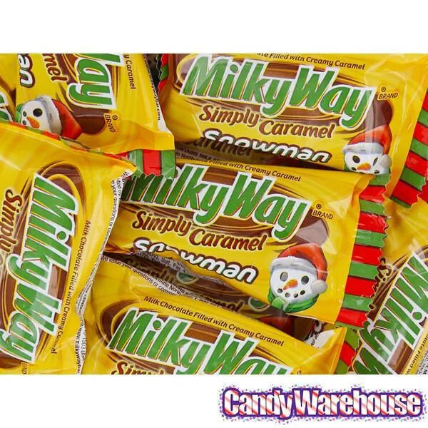 Display box contains 24 Milky Way Simply Caramel Snowman Christmas Candy Bars.