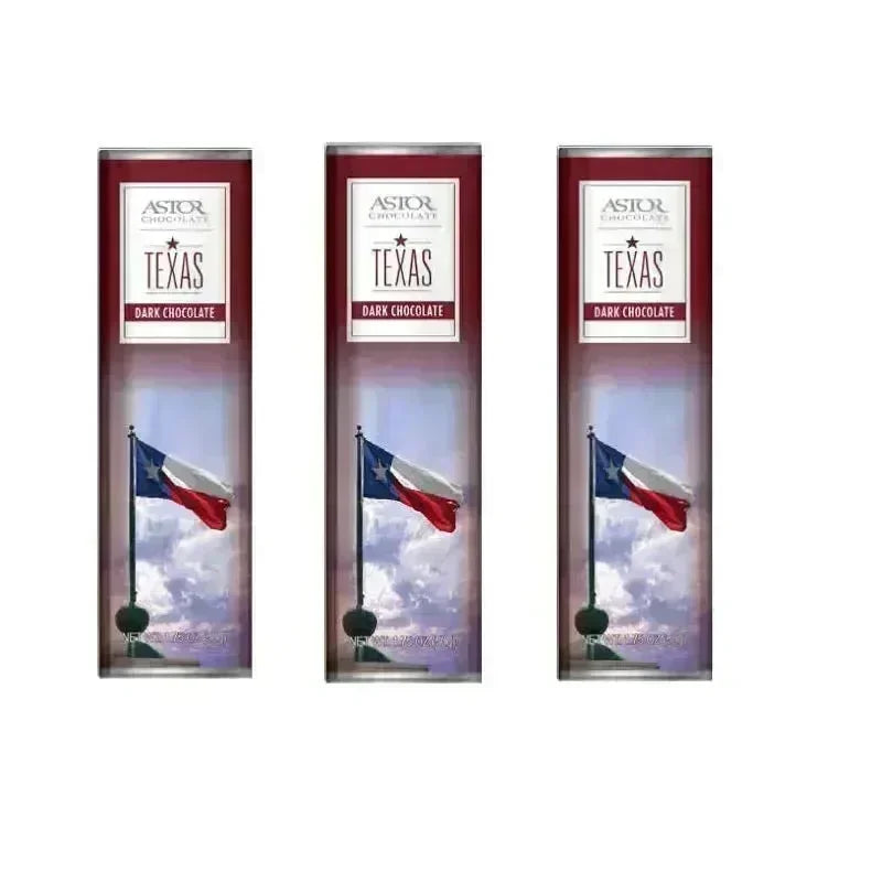 This product is meticulously stored in The Vault, a specialized facility designed to maintain ideal climate and light conditions, ensuring the utmost freshness and quality. Astor Chocolate takes pride in presenting the Texas Chocolate Bar, a delightful confection that beautifully showcases the beloved image of the Texas flag. Each bar is crafted with rich, premium dark chocolate, offering a smooth and indulgent experience with every bite. The striking design not only pays homage to Texas heritage but also makes it a perfect gift or souvenir for chocolate lovers and Texans alike. Whether you're savoring it yourself or sharing it with friends, the Texas Chocolate Bar is a delicious way to celebrate the Lone Star State.