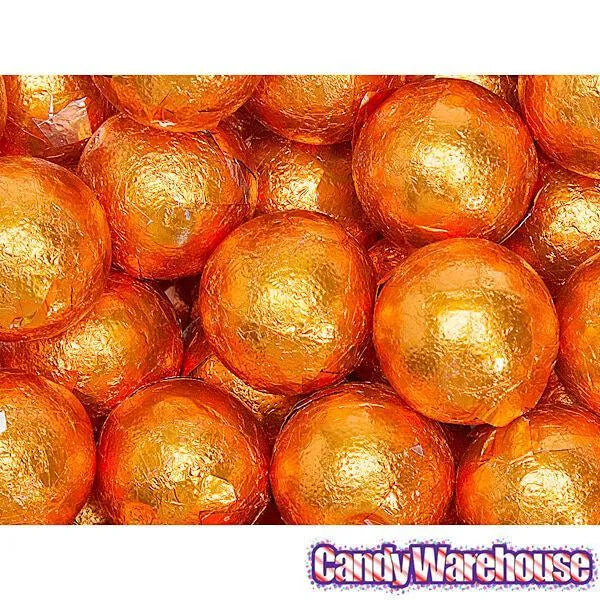 Bag contains 5 pounds of Orange Foiled Caramel Filled Chocolate Candy Balls.