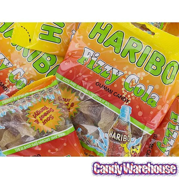 Case contains 3.75 pounds of Haribo Gummi Fizzy Cola Bottles Candy packed in 12 bags, each with a net weight of 5 ounces.