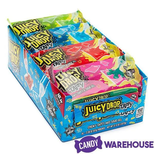 Display box includes 16 Juicy Drop Pops Taffy Candy Packs, each with about eight pieces of Juicy Drop Taffy and one tube of sour candy gel.