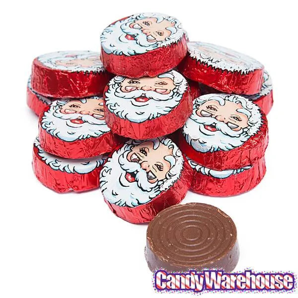 Bag contains 5 pounds of Foiled Crispy Milk Chocolate Christmas Santa Claus Face Candy Discs.