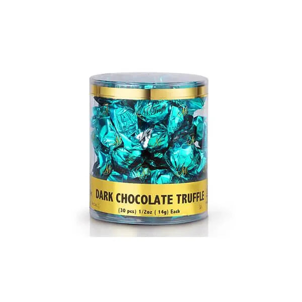 Gourmet dark chocolate balls filled with a smooth dark chocolate. Each delicious truffle is wrapped in bright turquoise green metallic foil.
