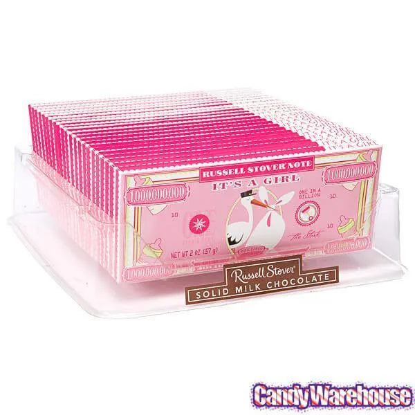 Display box contains 24 It's a Girl Russell Stover One in a Billion Dollar Chocolate Bars, each with a net weight of 2 ounces.