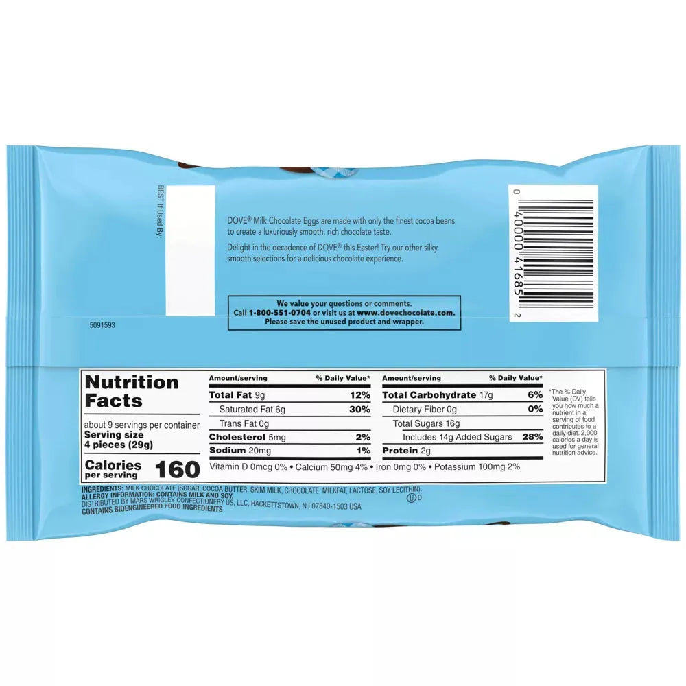 Bag contains 8.87 ounces of Dove Milk Chocolate Easter Eggs... that's about 35 pieces.