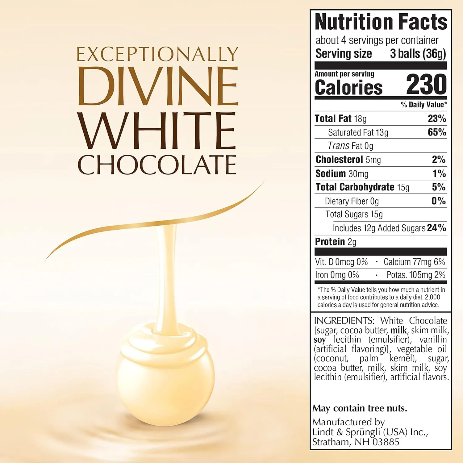 Actual product packaging and materials may include additional or different information than what is provided on our website. We advise you to read labels, warnings, and directions carefully before using or consuming any product.Indulge in the luxurious experience of LINDOR's renowned truffles with this exquisite creation. These creamy white chocolate truffles are enveloped in a silky white chocolate shell, delivering a delightful, melt-in-your-mouth sensation. Each bag features individually wrapped truffles, making it an ideal gift for yourself or your loved ones!