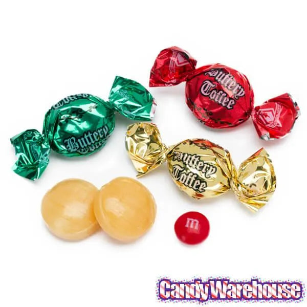 Rich butter toffee candies wrapped in festive red, green, and gold Christmas foils. Made with real butter!