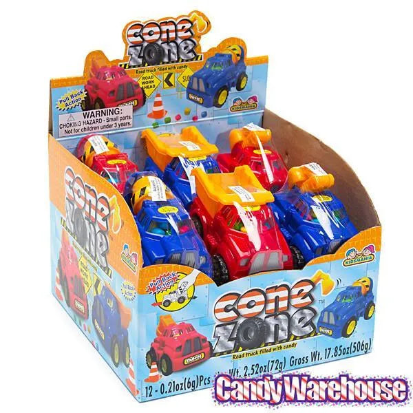 Display box contains 12 Cone Zone Construction Truck Candy Dispensers.