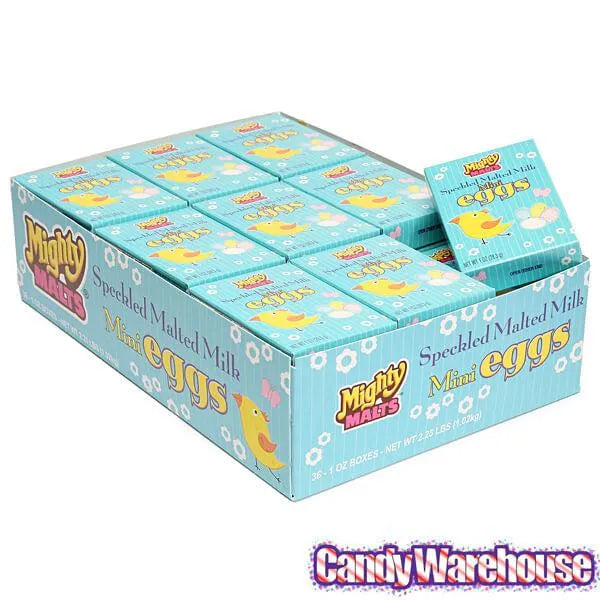 Display box contains 36 Mighty Malts Easter Eggs Candy Packets, each with a net weight of 1 ounce.