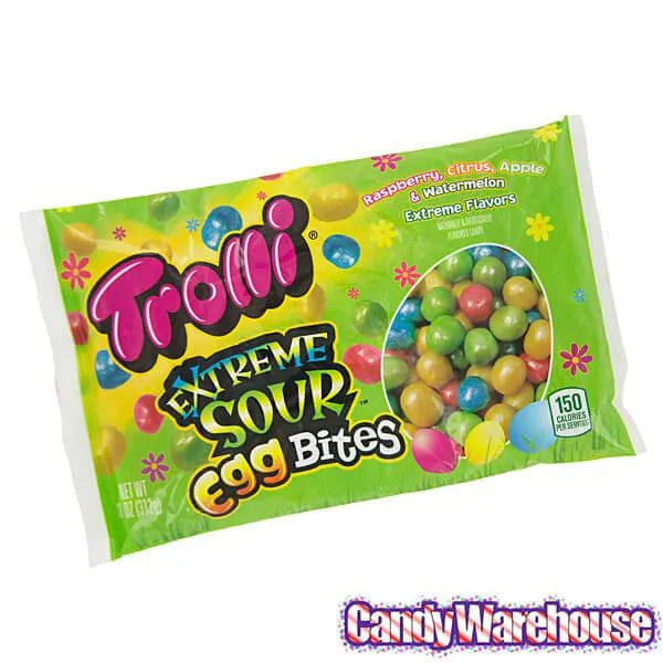 Bag contains 11 ounces of Trolli Extreme Sour Egg Bites Candy... that's about 80 pieces.