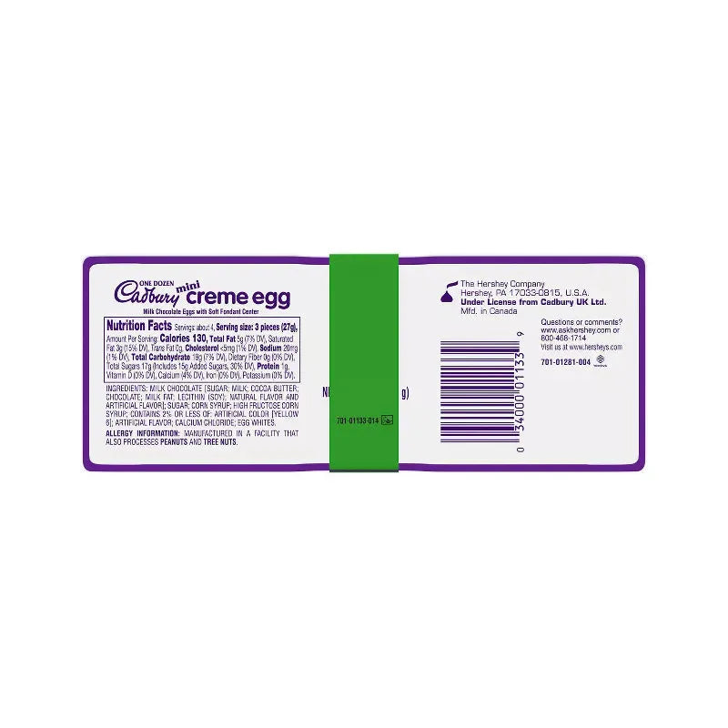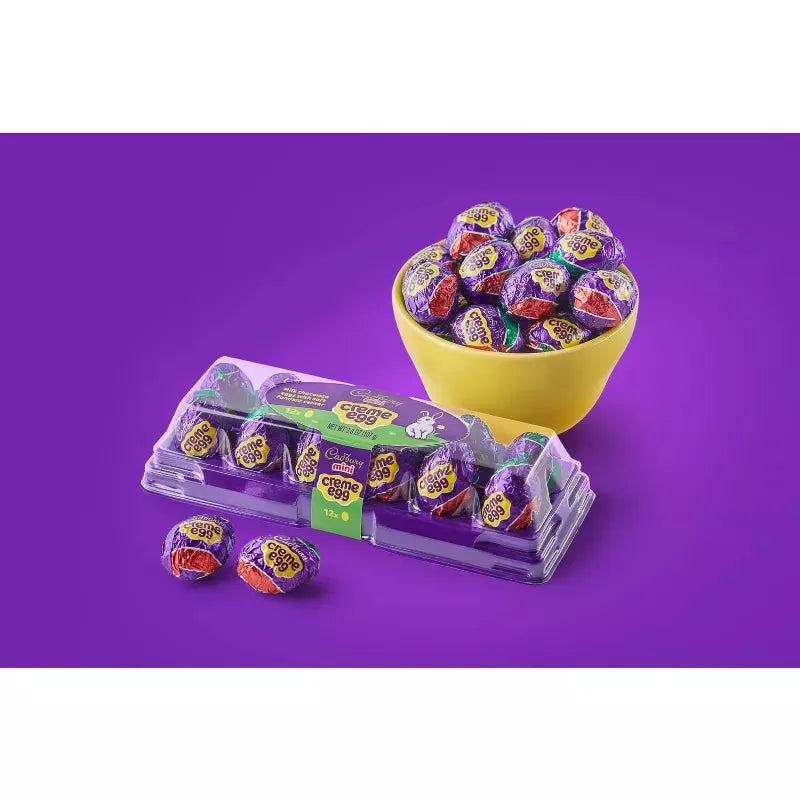 Get yourself a dozen of these "grade AA" chocolate eggs filled with white and yellow fondant.Egg Length: 1.25 InchesCarton holds 12 foiled Cadbury Mini Creme Eggs. Total net weight is 3.8 ounces.