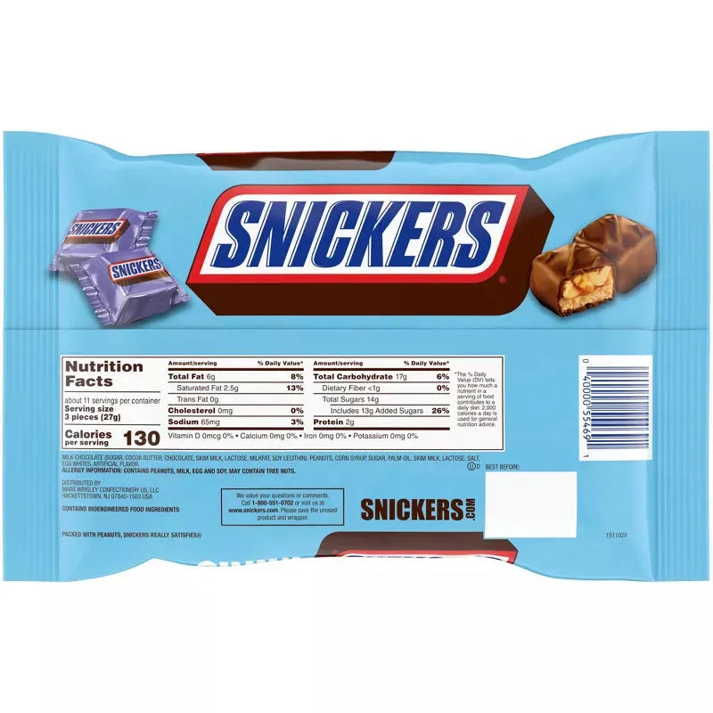 Bag contains 10.48 ounces of Easter Snickers Minis Candy... that's about 33 pieces.