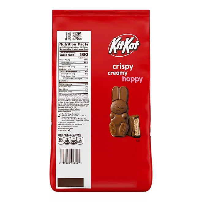 The KIT KAT Easter Milk Chocolate Wafer Bunnies Candy brings a festive twist to the classic KIT KAT® crunch, available at Candy Warehouse! This 39.53-ounce bulk bag contains 65 snack-size bunny-shaped KIT KAT® chocolates, making them perfect for Easter baskets, candy dishes, and springtime celebrations. Each crisp wafer bunny is coated in smooth, creamy milk chocolate, delivering the irresistible crunch you love in a fun, seasonal shape. Kosher certified and great for sharing at family gatherings, Easter dinners, school lunches, and parties, these adorable treats are a must-have for any Easter celebration. Grab your KIT KAT® Easter Bunnies today from Candy Warehouse and enjoy a festive chocolate delight!