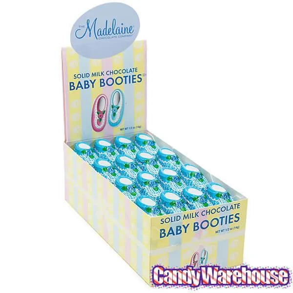 Display box contains 64 Blue Foil Wrapped Milk Chocolate Baby Booties, each with a net weight of 0.5 ounce.