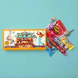 Boogie down memory lane with the 1970’s Decade Candy Box, filled with funky favorites from the disco era! This 6.5 oz blast from the past features a fun assortment of classic 70’s treats like Blow Pop®, Bottle Caps® Candy, Bubble Yum® Gum, Laffy Taffy® Mini Bars, Pop Rocks® Cherry, Ring Pop®, and Smarties Pop®. Wrapped in vibrant disco-themed packaging with hidden trivia from the decade, it’s perfect for milestone birthdays, retro-themed events, or candy collectors.