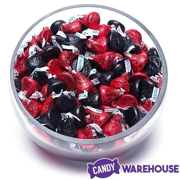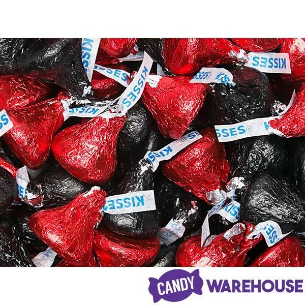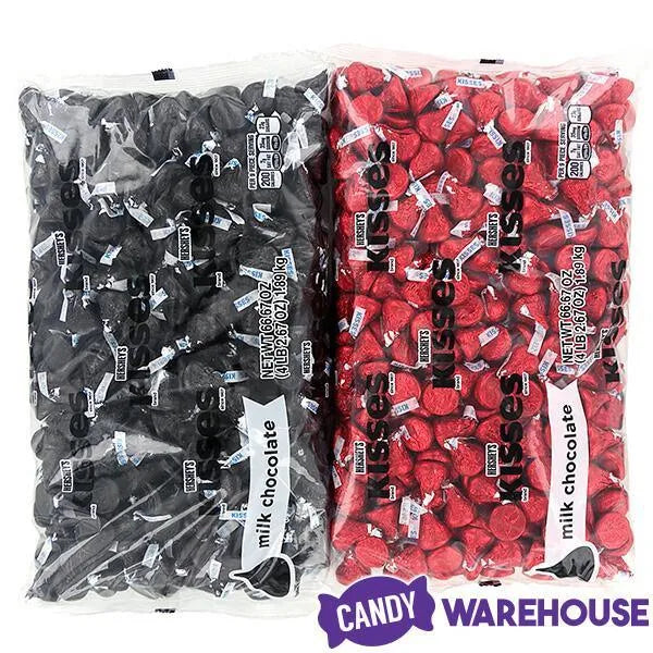 Box contains 800 pieces of Hershey's Kisses Red Foiled and Black Foiled Milk Chocolate Candy packed in two bags, each with a net weight of 66.7 ounces.