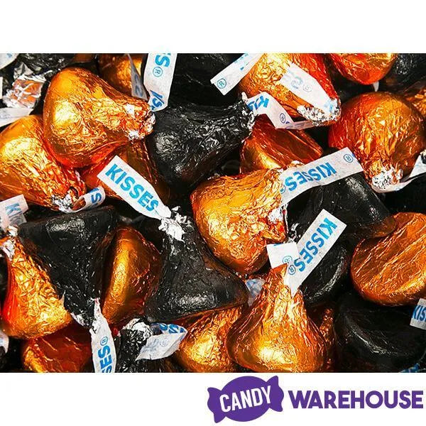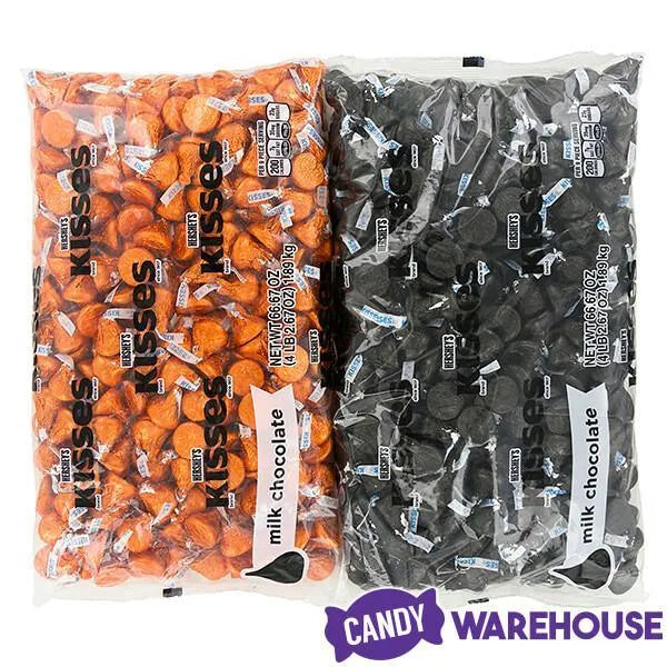 Box contains 800 pieces of Hershey's Kisses Orange Foiled and Black Foiled Milk Chocolate Candy packed in two bags, each with a net weight of 66.7 ounces.