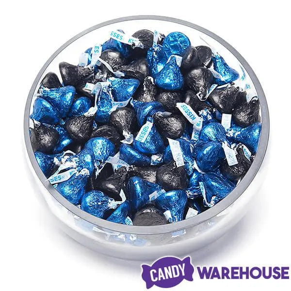 Box contains 800 pieces of Hershey's Kisses Dark Blue Foiled and Black Foiled Milk Chocolate Candy packed in two bags, each with a net weight of 66.7 ounces.