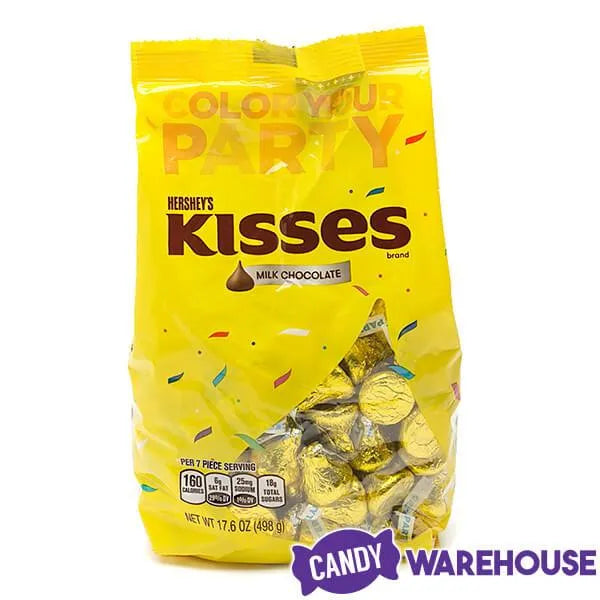 Bag contains 17.6 ounces of Hershey Kisses Yellow Foiled Milk Chocolate Candy... that's about 100 pieces.